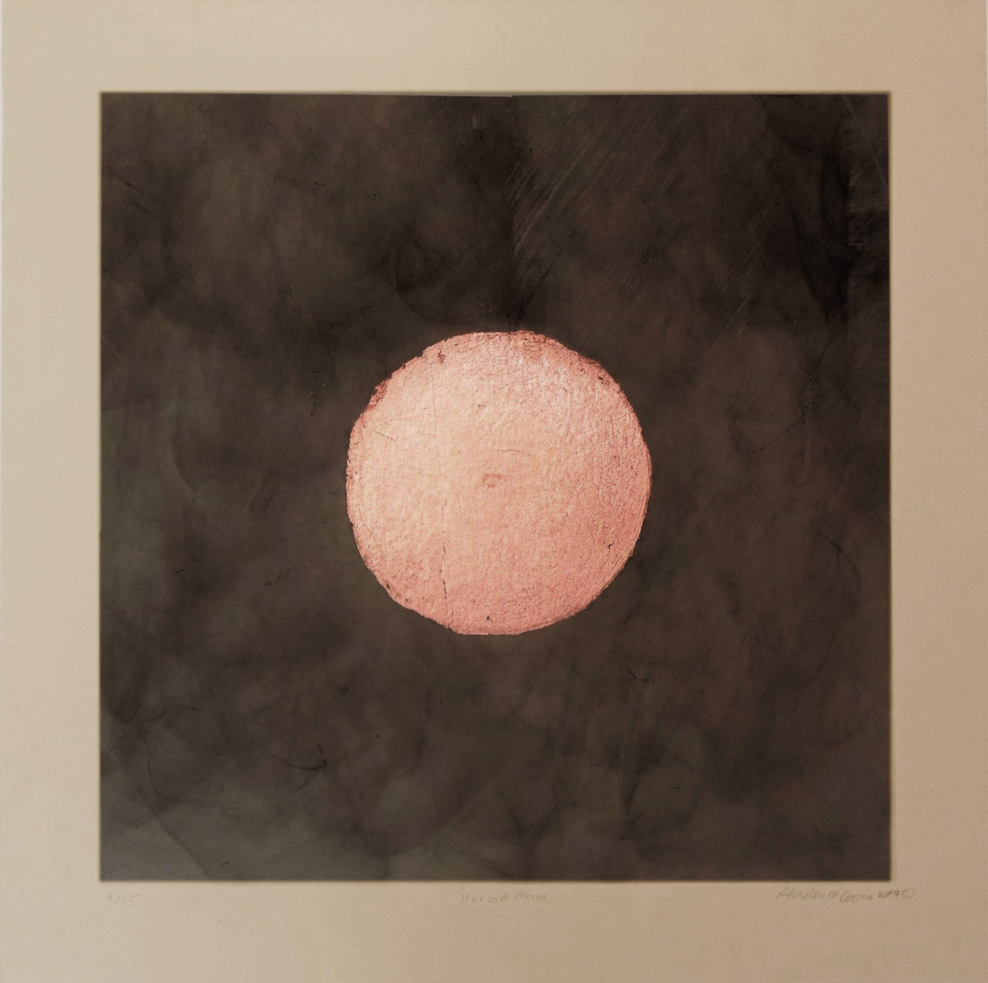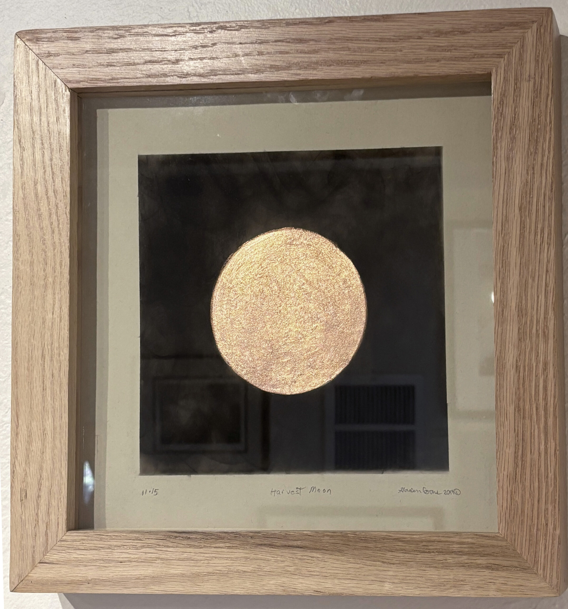 Gordon Coons. Ojibwa & Ottawa – tribes. Copper leaf, Framed block print with cedar smoke. Signed, titled, dated, and editioned print recto.