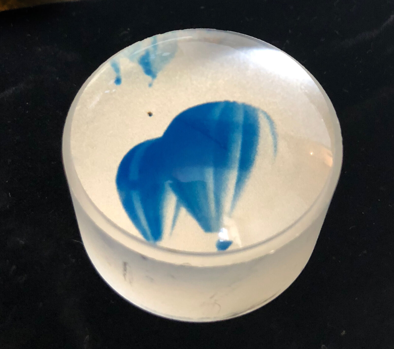 Ryan Zoghlin. Glass lens object. Cyanotone print: Cyanotype print on glass lens backed with pure silver powder Lens is approx. 1 ½” diameter x 1 1/8”.