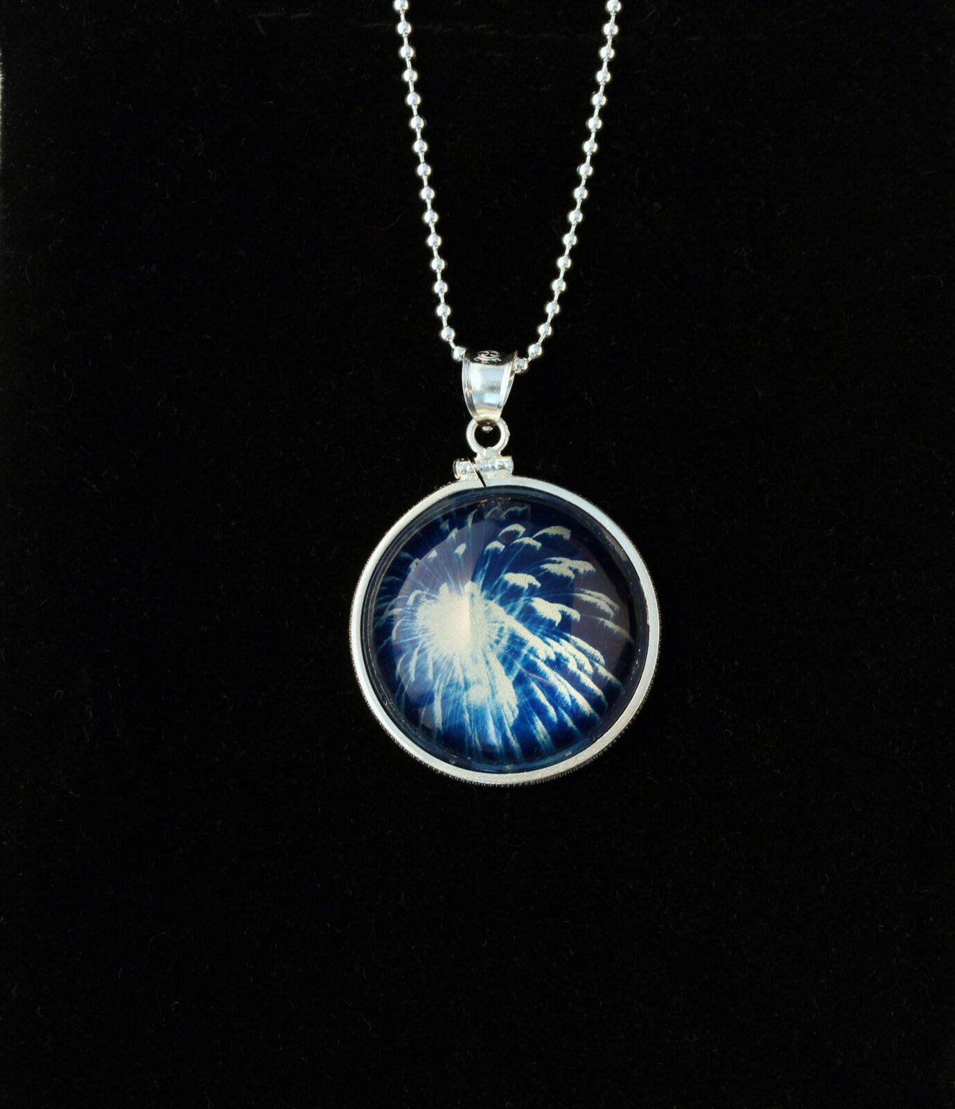 Ryan Zoghlin. Cyanotone print: Cyanotype print on glass lens backed with pure silver powder. Presented with silver bezel and chain. Pendant is approx. 1 1/8” diameter x 7/16” deep glass lens.